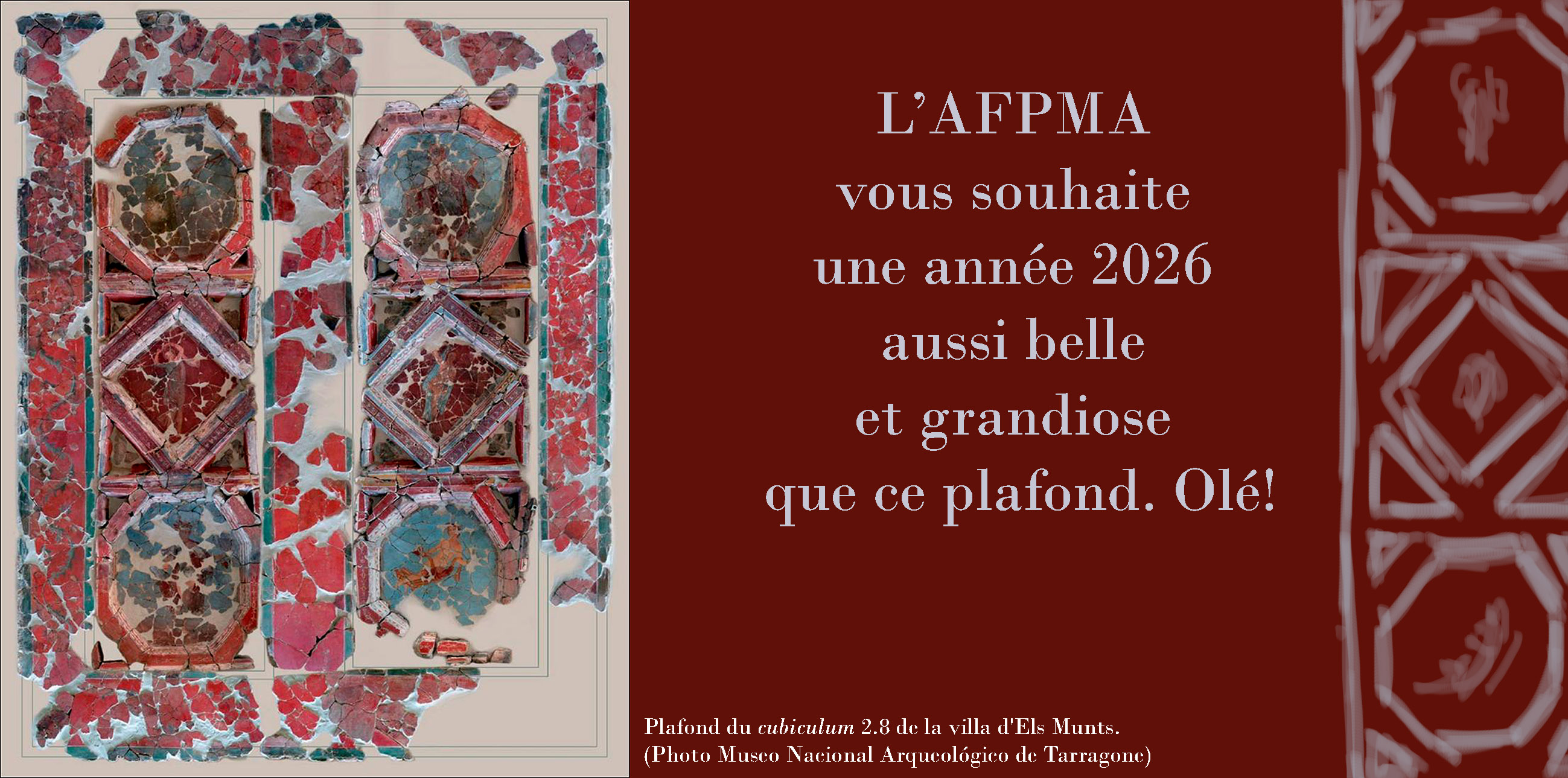 Avec quelques jours de retard mais de tout cœur, le bureau et le CA de l’AFPMA vous souhaitent une belle et heureuse année 2026 ! Qu’elle soit baignée du soleil qui nous attendra (espérons) à Tarragone ! La carte de vœux, réalisée par Maud Mulliez, évoque notre prochaine destination avec le superbe plafond de la villa d’Els Munts, présenté par Carmen Guiral Pelegrín qui nous accueillera en novembre prochain (des informations suivront).